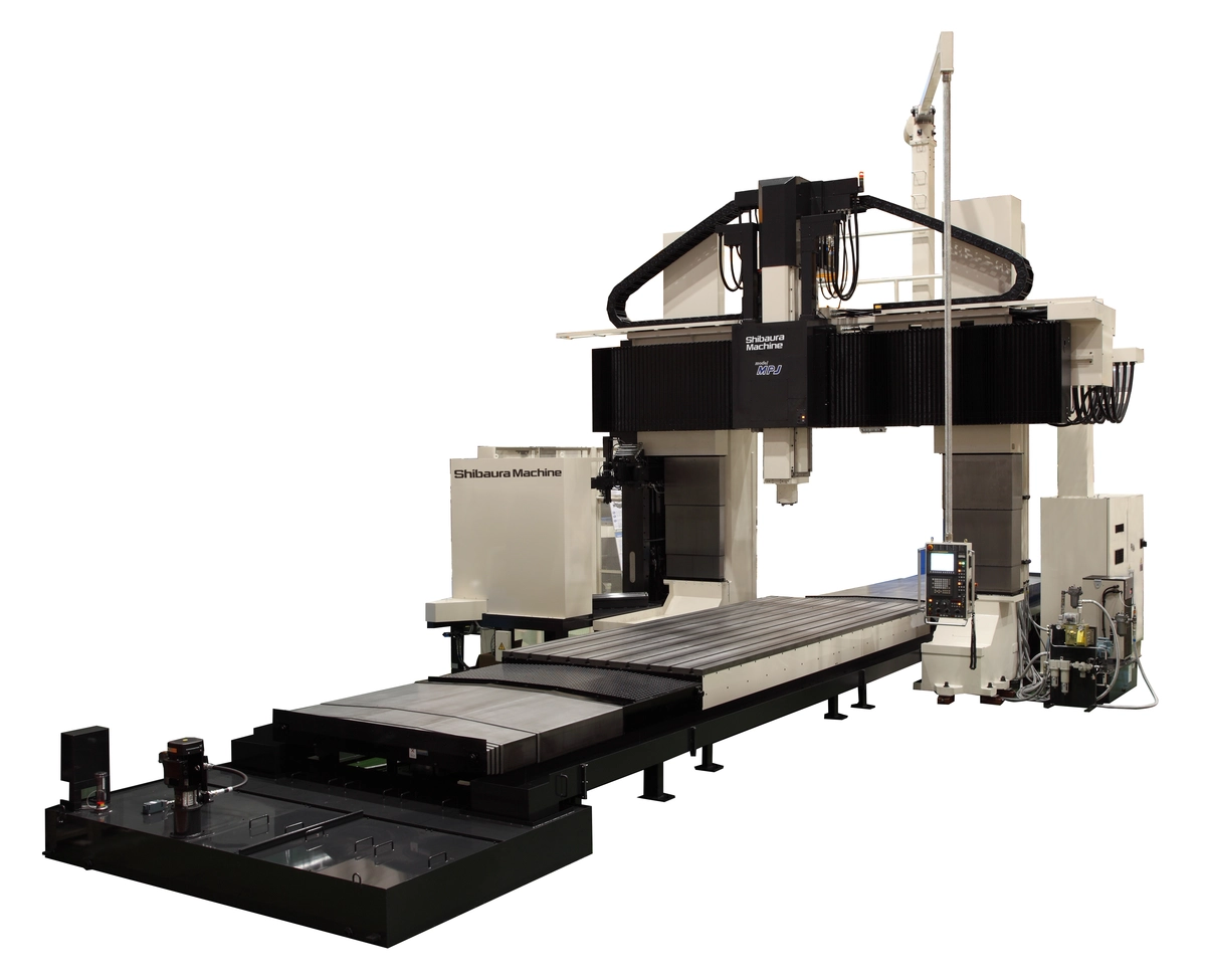 Shibaura Machine MPJ-M Double-Column Type CNC Machining Center, TSC, Big-Plus Spindle, 4-Pos Automatic Attachment Indexing Device, Ram-type Spindle Head, W-Axis NC Positioning, Table Lubricant Oil Cooling Unit, Tool Clamping/Unclamping, Ram Cooling Oil Temperature Regulator Unit
