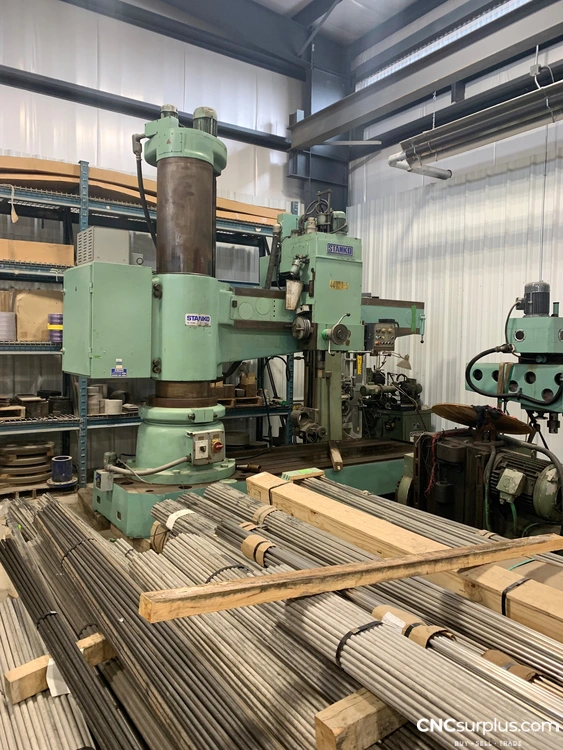 1990 Stanko 2A576 Radial Arm Drilling Machine, 117" Arm Length, Hydraulic Preselect Speed Control, Spindle Feed Adjustable Clutch W/ Depth Stop, Pressurized Pump Lubrication System, Large T-Slotted Base