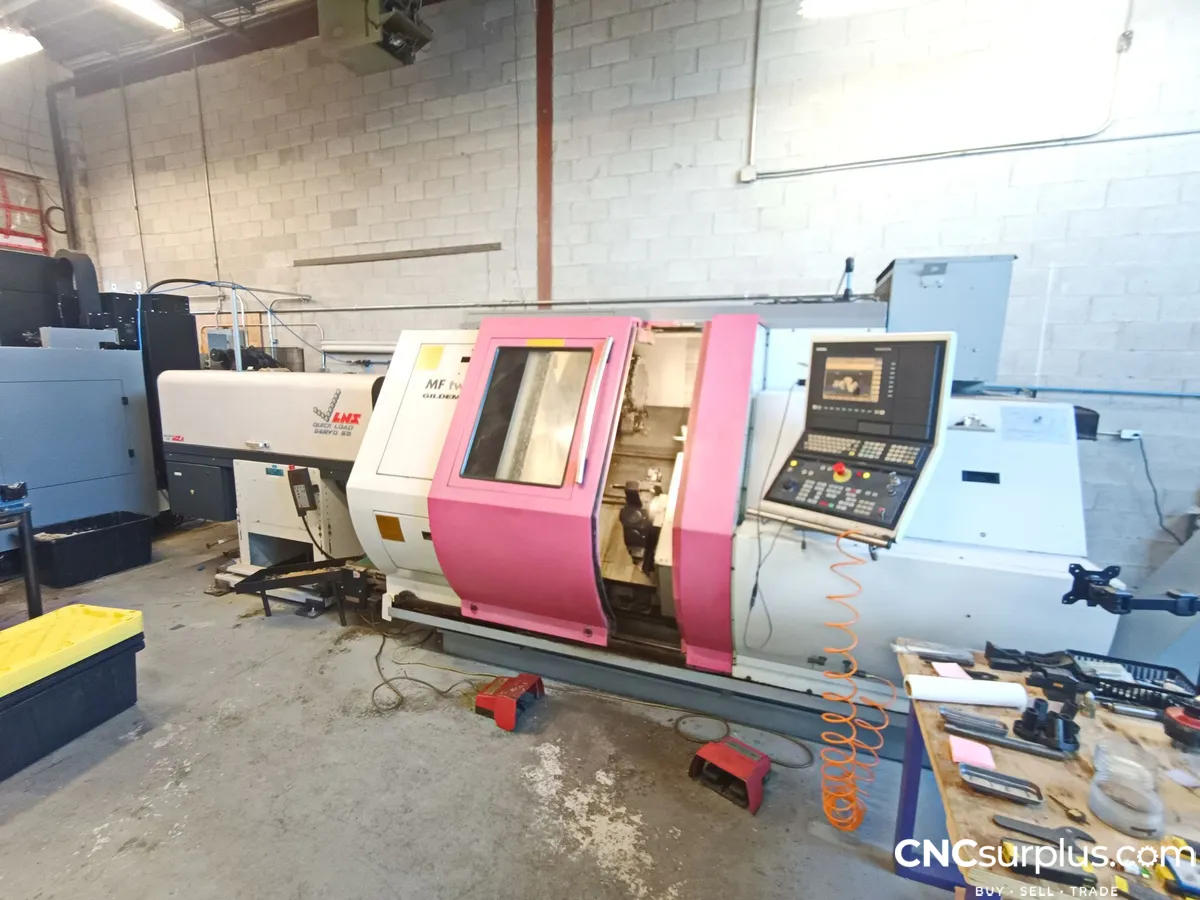 2000 Gildemeister MF Twin 65 Multi-Axis CNC Lathe, Twin Turret, Sub-Spindle, Y-Axis, C-Axis, Live Tooling, LNS Quick Load S2 Bar Feeder, Chip Conveyor, Parts Catcher, Additional Tooling